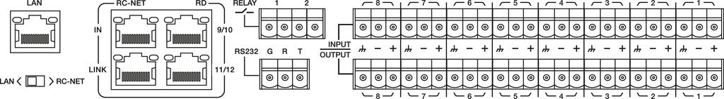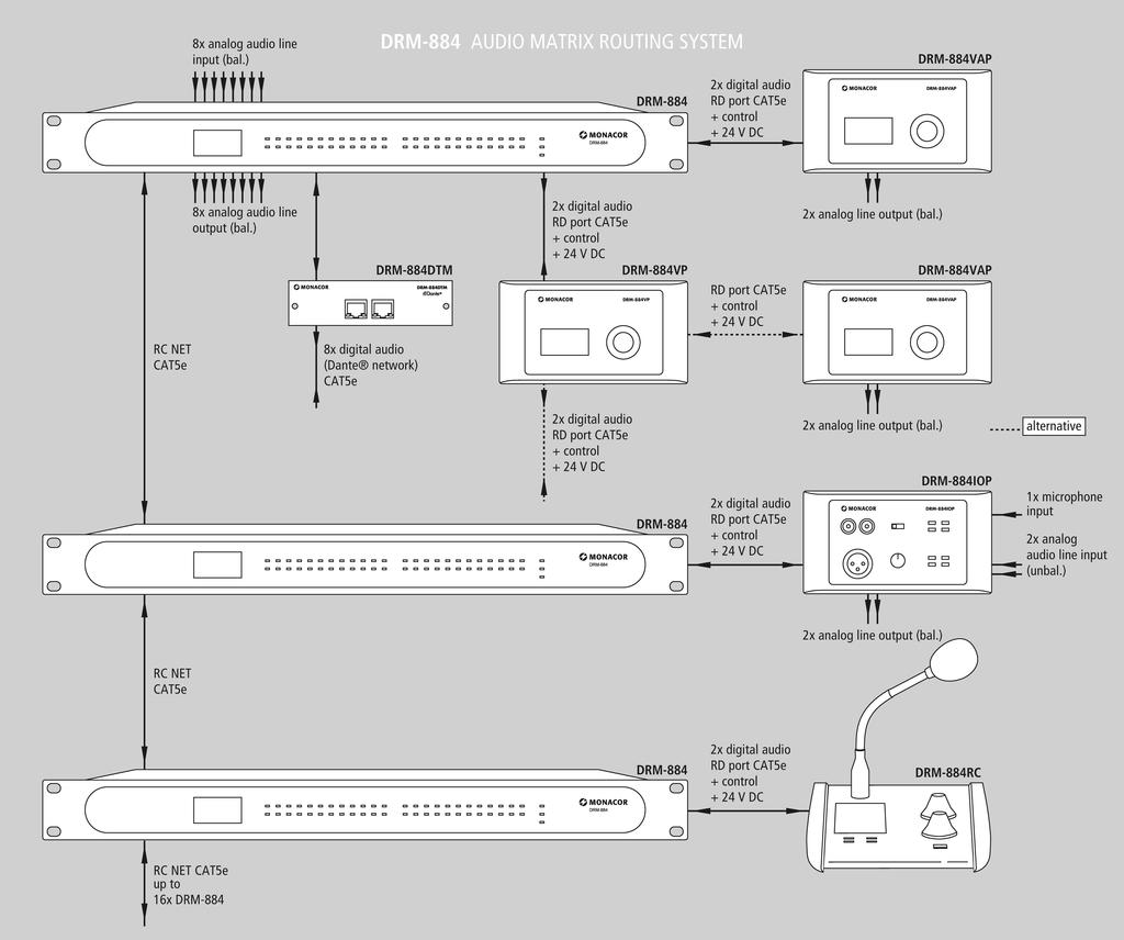 Expand your options with the matrix system: if you need a larger number of inputs and outputs, the system can be extended from a maximum of 16 x DRM-884 and optional Dante® module to 192 inputs x 192 outputs by means of cascading.