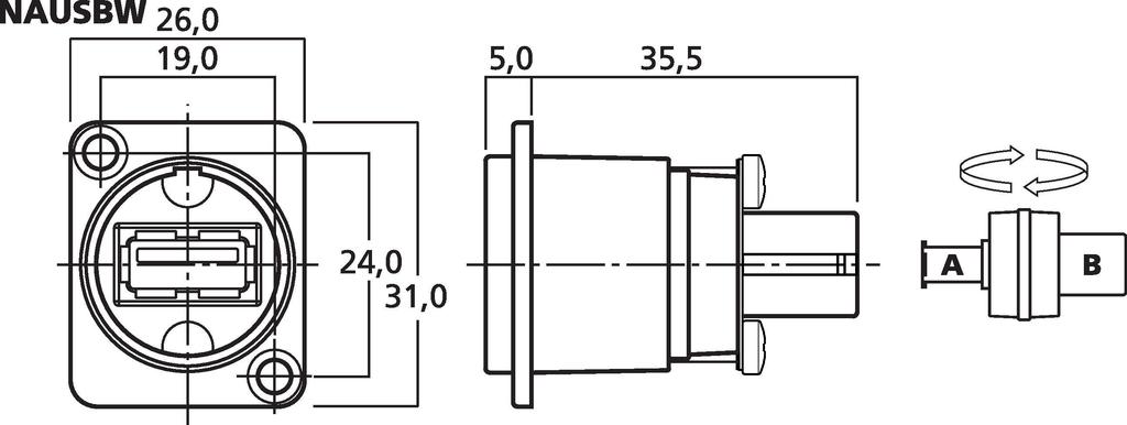 - Reversible adapter for feed-through direction: Type-A/Type-B or Type-B/Type-A