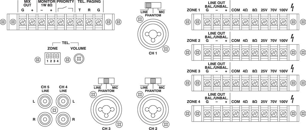 - Each input channel with gain control, 2-way tone control, channel mute switch and zone routing switch