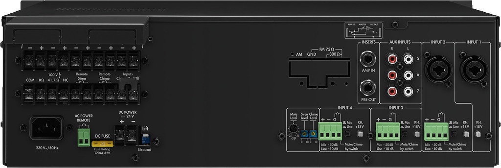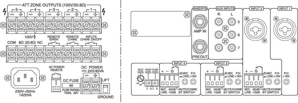 During operation, there may be a hazard of contact with a dangerous voltage of up to 100 V at the speaker terminals. Always switch off the amplifier before making or changing any connections.