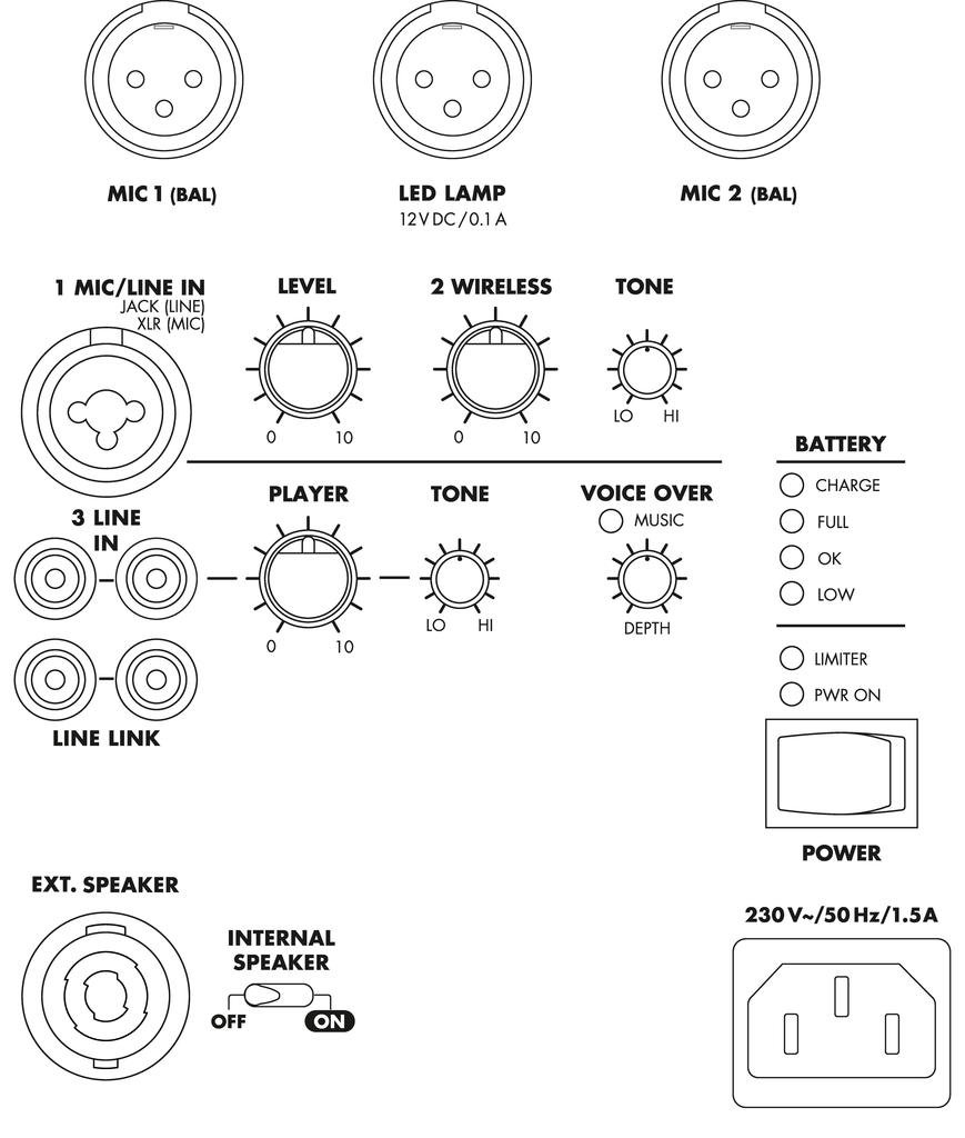 - 1 input via comb. jack mic (XLR)/line (6.3 mm jack)