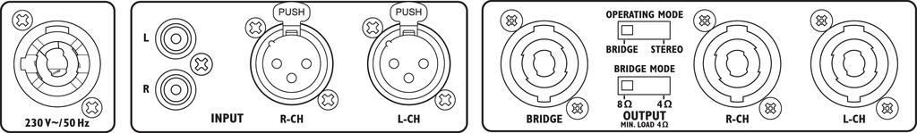 - 2 operating modes can be selected (stereo or bridged)