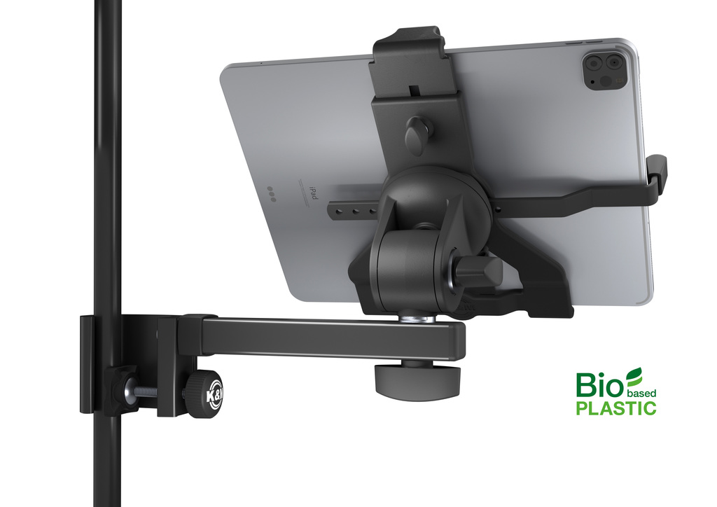 Universal tablet holder with a practical clamping mechanism for any tablet with an approx. size of 254-406 mm (10"-16"). The tablet holder is made of bio-based plastic. These plastics contain a proportion of over 50% up to 100% of renewable plant-based raw materials. The clamping area of the tablet holder is between 158 and 280 mm. In addition, the holder is particularly suitable for the use of tablets with a protective cover or case with a thickness of up to 20 mm. The overlapping clamping jaws with integrated rubber pads ensure secure positioning and eliminate unwanted vibration noises. Functioning of the device's operating controls is still maintained. An adjustable mounting bracket with felt padding provides additional safety if the tablet holder is tilted. This prevents the tablet PC from falling out, even under demanding operational conditions. The holder is suitable for pivoting and tilting which allows for any user to adjust it respectively. Horizontal pivoting can be adjusted from tight to loose movement via clamping screw. The tablet can, of course, easily be rotated between portrait and landscape format, while independent turning will be prevented. The holding arm with clamp is suitable for mounting onto tube diameters up to 30 mm.