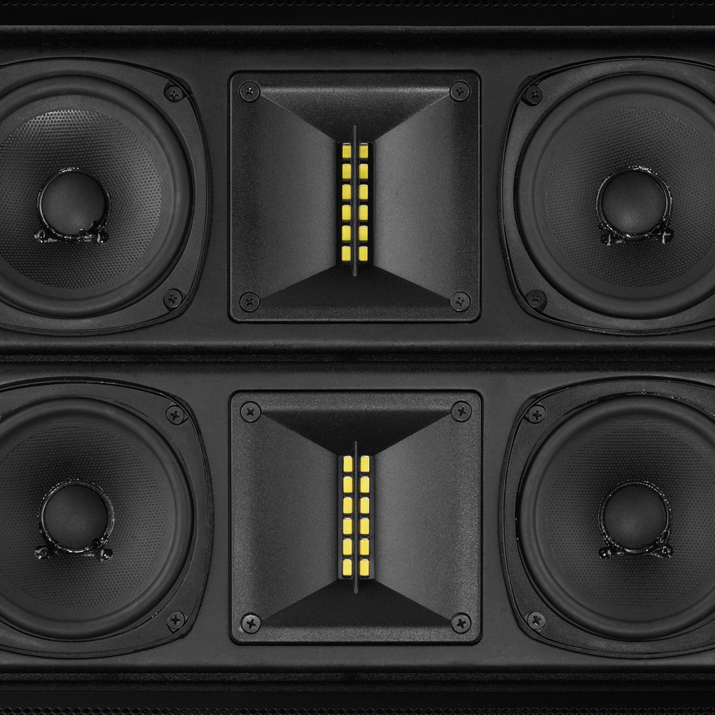 Compact array of high power capability with 4 mid-high range speaker units and a dual bass module, each section with its own 350 W power amplifier and controlling software (the configuration of the system is supported by a PC, but it operates as a stand-alone unit). Supplied with extensive and variable equipment for suspended mounting systems (Flyware). The mid-high range systems are each equipped with 2 x 10 cm (4") high-performance speakers and a magnetostatic speaker for a perfect reproduction rich in detail. The dynamic characteristics are absolutely convincing, at the same time the tonality at the basic setting is very pleasant. Despite its compact size, the bass module with 2 x 20 cm (8") bass speaker provides an amazingly deep bass reproduction and a high level stability which is only possible by using special bass speakers of very high power capability and the comprehensive DSP optimisation.