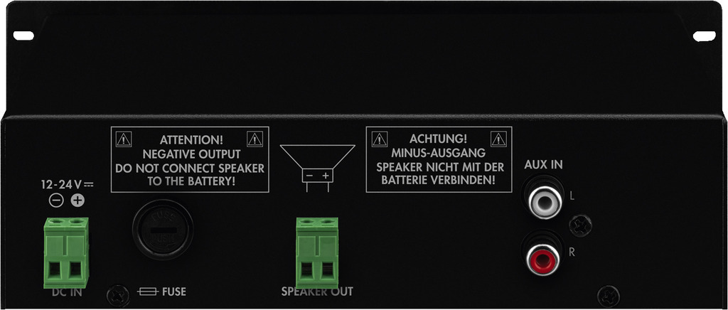 The compact dimensions of the amplifier which are matched to the dimensions of a standard slot in a motor vehicle and the voltage supply of DC 12-24 V allow for a wide range of additional applications.