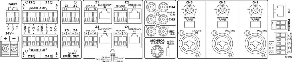 - Optional connection for up to 32 zone paging microphones PA-4000RC