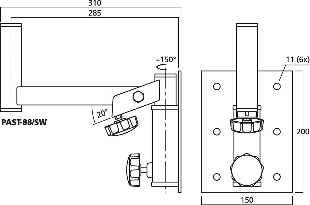 - Pivoting (approx. 150°) and tilting (approx. 20°), to be secured with locking screws